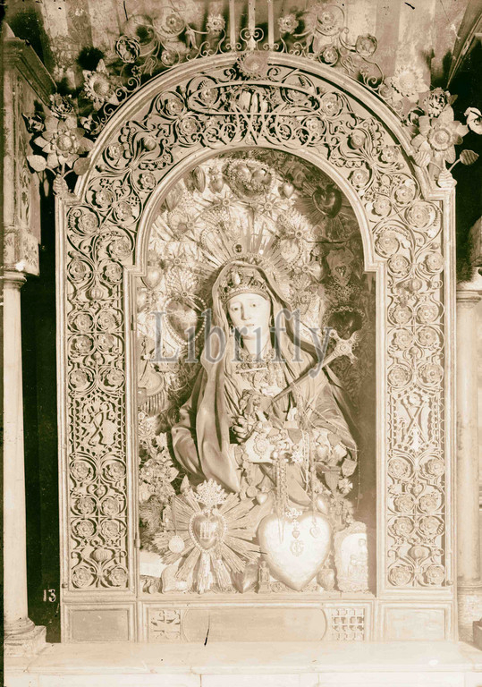 Church of the Holy Sepulchre and surroundings. Statue of the Virgin, bedecked with jewels 1900, Jerusalem, Israel