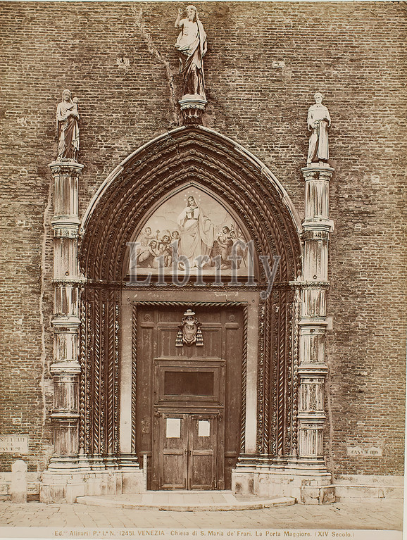 Church, S, Maria dei Frari, main portal, Venice, albumin paper, black, white positive process, Chiesa di S, Maria dei Frari, La Porta Maggiore, XIV Secolo, Recto noted, lead, facade, completed, Madonna, attributed, Niccolo Pisano, travel photography, architectural photography, facade decoration, architecture, portal, church building, hist, Building, Site, Street, Sculpture, Sculpture, Sculpture art, Christ, Mary, Christ Child, Madonna, Venice