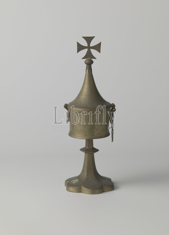 Ciborium, Maltese cross, object, composed, following parts, cast, hammered foot, riveted, hammered, twisted bottom, box, hinge, closure, wall, lid, button, foot, hexagonal nodus, extends six-lobed, weapon, engraved, lob, 1 anchor, 2 cross, round box, round tapered lid, decorated, rings, pin closure, dragons, coat, arms, applied, second half, seventeenth century, Rijnstreek, c, 1500, 1525, 1600, 1699, brass, alloy, engraving
