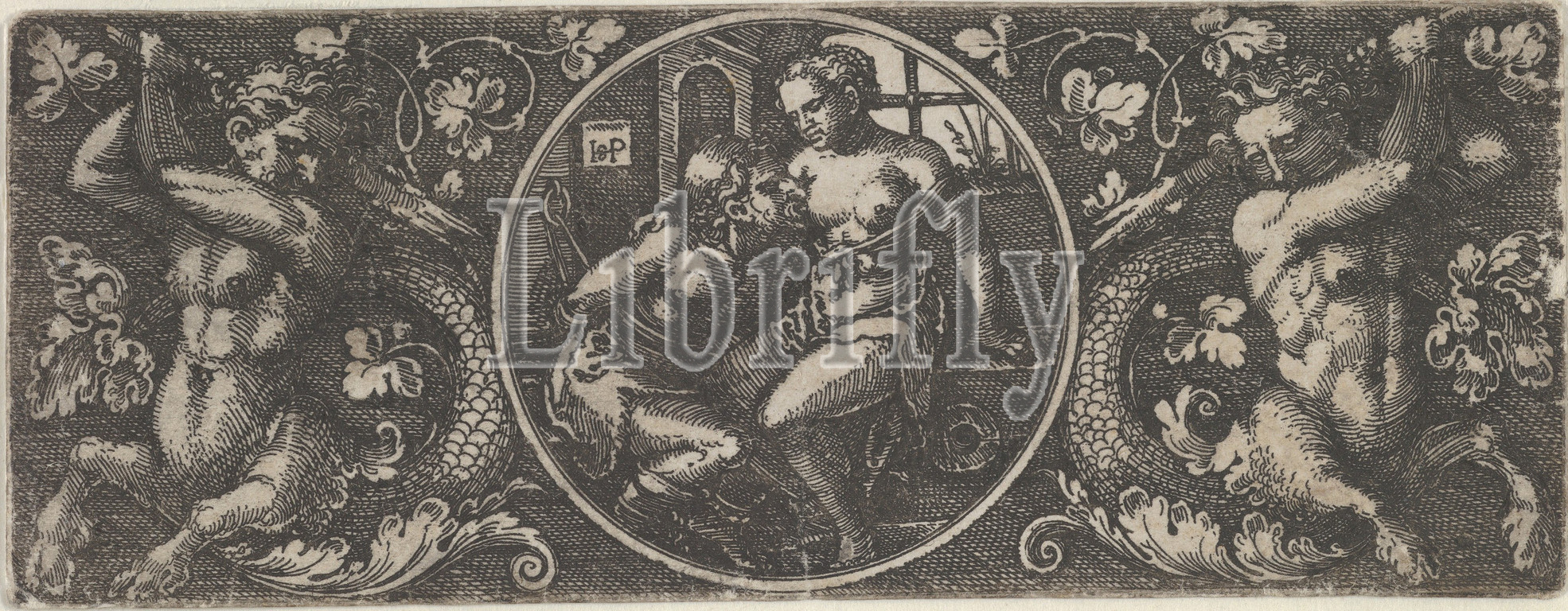 Cimon, Pero Flanked, Two Tritons, 1518–30, Engraving, Sheet, 1 1/2 x 4, 3.9 10.1 cm, Sebald Beham, German, Nuremberg, 1500–1550, Frankfurt, center, medallion, Cimon kneeling, left, seated, right, tritons, flank