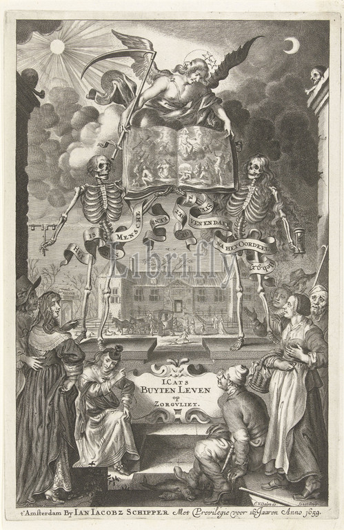 City people, farmers look, two skeletons, angel, book opened, presentation, last judgment Title page, Jacob Cats, Buyten Leven, Zorgvliet, Amsterdam 1659 Buyten Leven, title, object, Stadsmensen, last judgment, final judgment, view, advised, live virtuous lives, background, landscape, large house, city dwellers enjoy themselves simply, virtuously outside, city, subject, main poems, edition, banderole, skeletons, text, Hebrews 9, 27, Last Judgment, life versus death, Cornelis van Dalen, II, mentioned, Amsterdam, 1659, paper, engraving