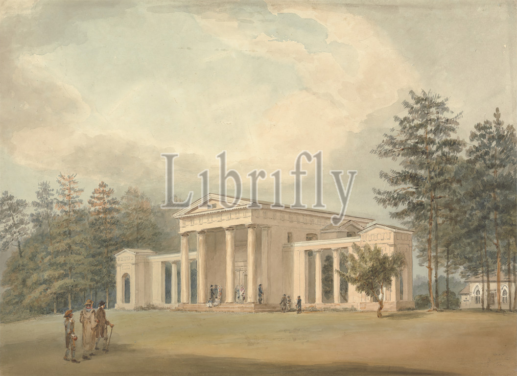 Classical Church, Ayot St, Lawrence, Hertfordshire, Samuel Davis, 1757–1819, British, Watercolor, graphite, medium, slightly textured, cream wove paper, Sheet, architectural subject, architecture, church, Classical, columns, landscape, religious architecture, religious buildings, trees, Ayot Saint Lawrence, England, Europe, Hertfordshire, United Kingdom