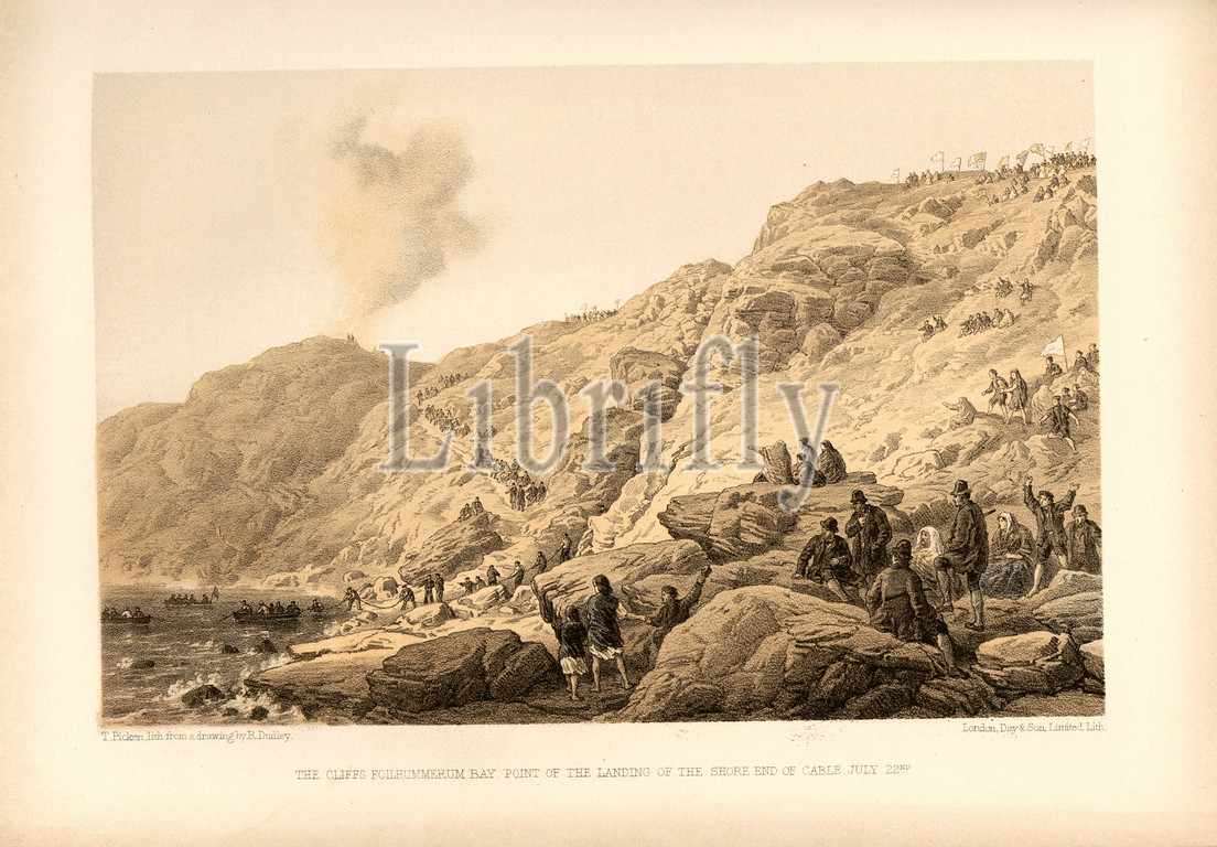 cliffs Foilhummerum Bay point, landing, shore, cable, July 22nd, Foilhummerum Bay, Valentia Island, Ireland, Location, Transatlantic Cable, July 22, 1865, Signed, T. Picken, lith., drawing, R. Dudley, London, Day &, Son, Limited, Lith, Fig. 12, p. 46, Dudley, Robert, ill., Picken, Thomas, Day & Co, 1866, William Howard Russell, Robert Dudley, atlantic telegraph, Dedicated, special permission, Royal Highness Albert Edward Prince, Wales, London, Day, son Limited, 1866