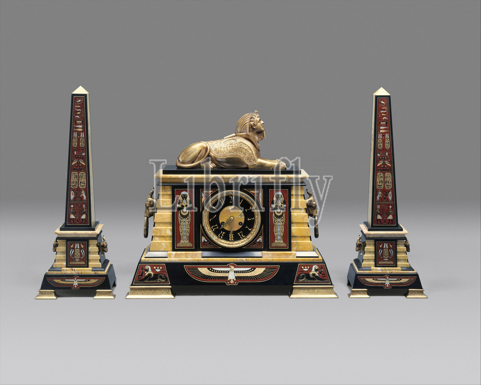 Clock, ca, 1885, New York, United States, American, Marble, bronze, 18 1/8 x 20 7 3/4, 46 51.1 19.7 cm, Metal, Tiffany & Co., 1837–present, &, Co, marketed, ormolu, marble mantel, set, consisting, clock, pair, decorative obelisks, represents, popular, archaeological idea, Egyptian art, hieroglyphs, obelisks, sphinxes, bear, scrutiny, Egyptologist