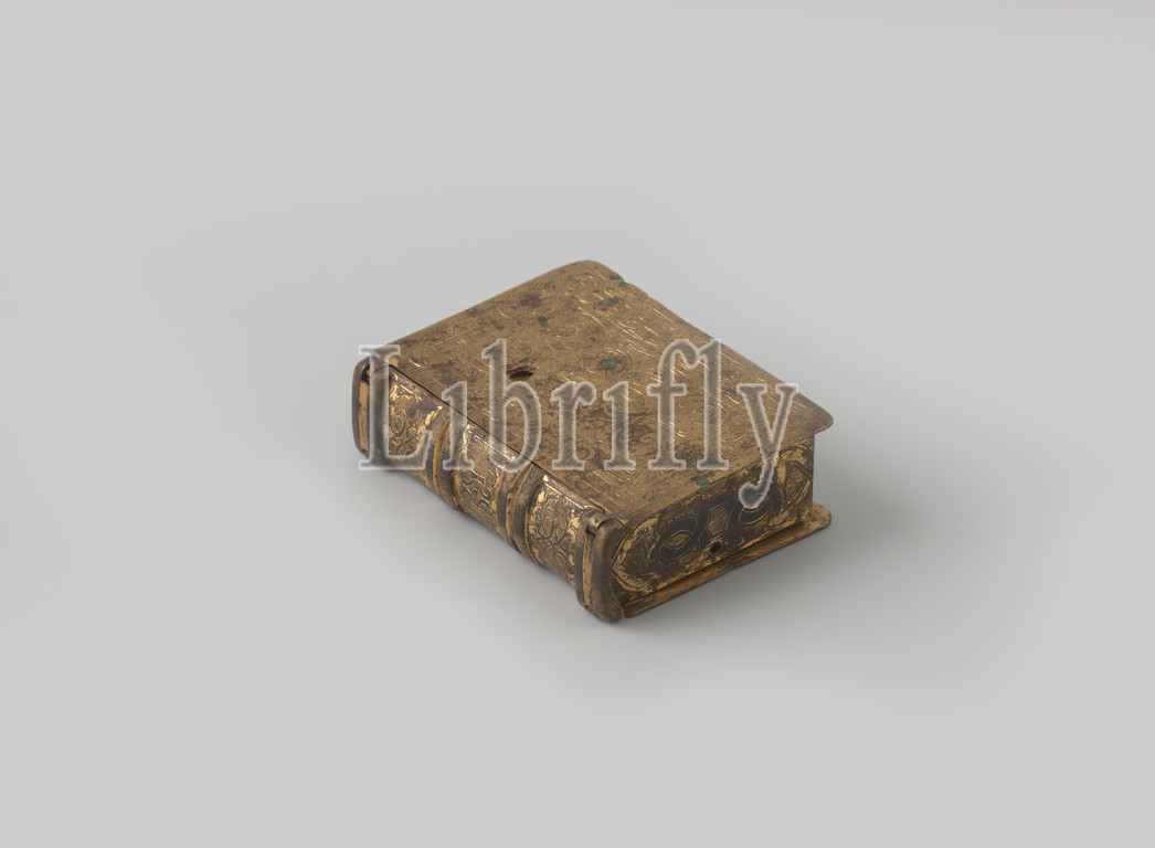 Clock case in the shape of a book, Clock case in gilt copper in the shape of a book. The outside of the sheets is engraved with a ribbon-shaped flat ornament, the inside with a niello ornament. The dial has twenty-four digits. The corners are filled with the four winds. At the top a ring. The timepiece is missing., anonymous, c. 1590 - c. 1610 and/or c. 1550 - c. 1600, copper (metal), gilding (material), gold (metal), engraving, h 6 cm × w 4.7 cm × t 1.8 cm