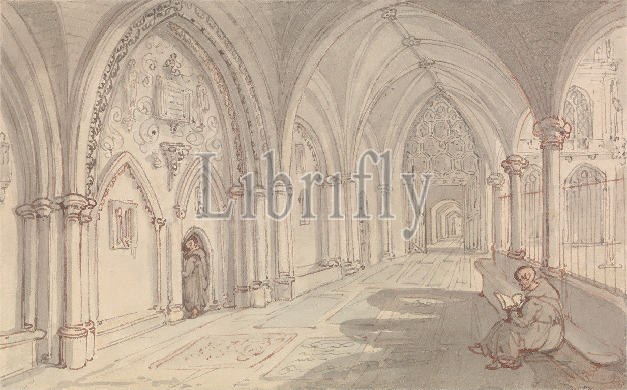 Cloisters, Monastery, Thomas Rowlandson, 1756–1827, British, Watercolor, graphite, pen, red ink, pen, gray ink, medium, smooth, cream wove paper, Sheet, archways, cloisters, corridors, doorway, genre subject, monastery, monks, reading, sitting, vaulted ceilings