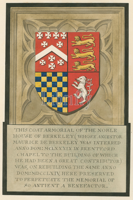 Coat Armoril of the Noble House of Berkeley from Brentford Church, Attributed to Daniel Lysons, 1762–1834, British, between 1796 and 1811, Pen and black ink, watercolor and gouache over graphite on medium, slightly textured, cream wove paper, Sheet: 14 7/8 × 10 3/4 inches (37.8 × 27.3 cm), architectural subject, armorial, church, memorial, Brentford Church, England, Greater London, London, Middlesex, United Kingdom