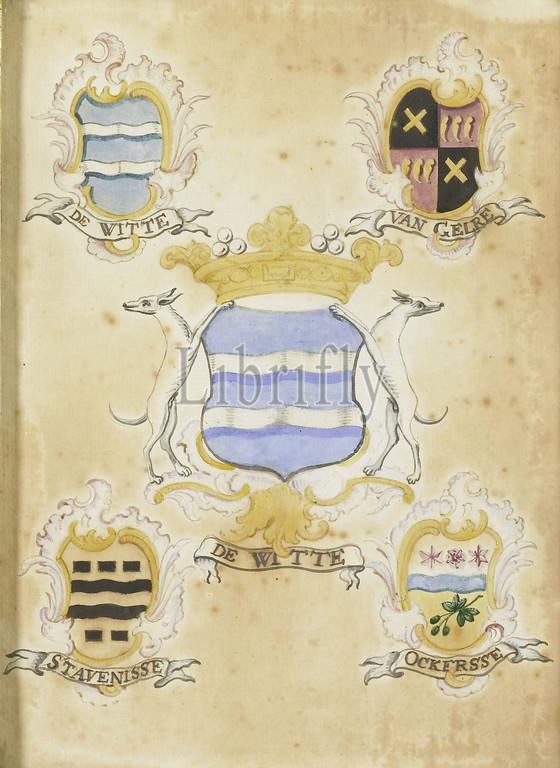 The coat of arms of Anna Jacoba de Witte, wife of Jacob Verheye of Citters, with the arms of her four grandparents, The coat of arms of Anna Jacoba de Witte (1758-1796), with the arms of her four grandparents: de Witte, Stavenisse, van Gelre and Ockersse. Part of a series of weapons belonging to the donation Jonkheer J. de Witte van Citters, The Hague, 1876. Part of the collection of heraldic objects., anonymous, Northern Netherlands, 1750 - 1799, paper, watercolor (paint), h 22 cm × w 16.5 cm d 3 cm