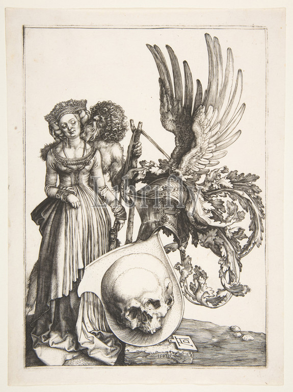 Coat, Arms, Skull, 1503, Engraving, Plate, 8 11/16 x 6 1/4, 22.1 15.8 cm, Prints, Albrecht Dürer, German, Nuremberg, 1471–1528, stunning engraving, Dürer recast, theme, memento mori, brilliantly unusual form, woman, patrician dress, identified, crown, bride, person, embraces, wild man