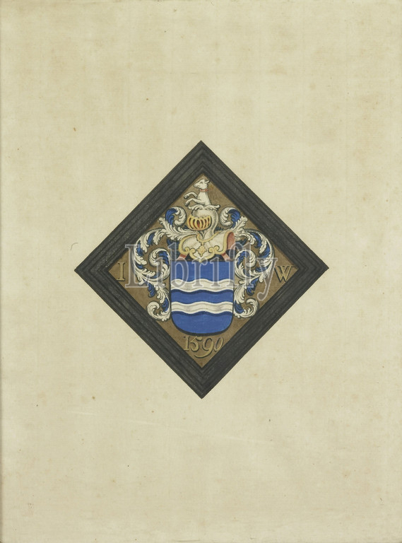 The coat of arms of the de Witte family, after a diamond funeral mourning plate with the initials IW on both sides of the shield and the year 1590, The coat of arms of the Witte family, after a diamond-shaped funeral mourning plate with the initials IW on both sides of the shield and the year 1590. Part of a series of weapons belonging to the donation Jonkheer J. de Witte van Citters, The Hague, 1876. Part of the collection of heraldic objects., anonymous, Northern Netherlands, 1750 - 1799, paper, watercolor (paint), h 32.5 cm × w 25 cm d 2.3 cm