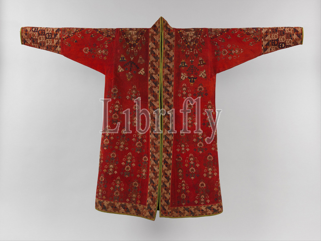 Coat (Choga), mid-19th century or earlier, Made in Present-day Turkmenistan, Ground fabric: hand-spun red plain-weave wool (warp and weft); embroidery: silk; facing: ikat silk (warp), cotton (weft); lining: roller-printed Russian cotton, H. from shoulder to bottom hem: 50 3/4 in. (129 cm), Textiles, Renowned for their knotted-pile carpets and storage bags, Turkmen weavers also produced magnificent examples of wearable art such as this remarkable coat. The decoration of the exterior consists of geometric and abstract floral motifs and is among the best examples of Turkmen embroidery
