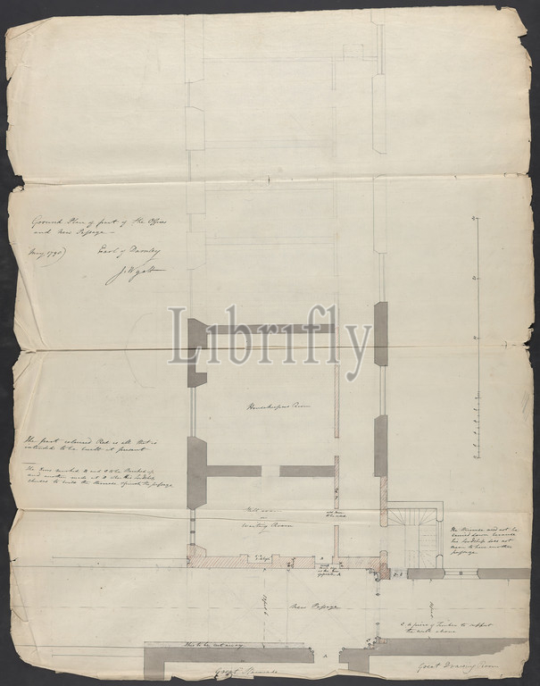 Cobham Hall, Kent, Ground Plan, Part, Offices, New Passage, James Wyatt, 1746–1813, British, 1798, Graphite, pen, black ink, gray wash, medium, moderately textured, cream laid paper, Sheet, architectural subject, drawing rooms, plans, drawings, stairs, Cobham, Cobham Hall, England, Kent, United Kingdom