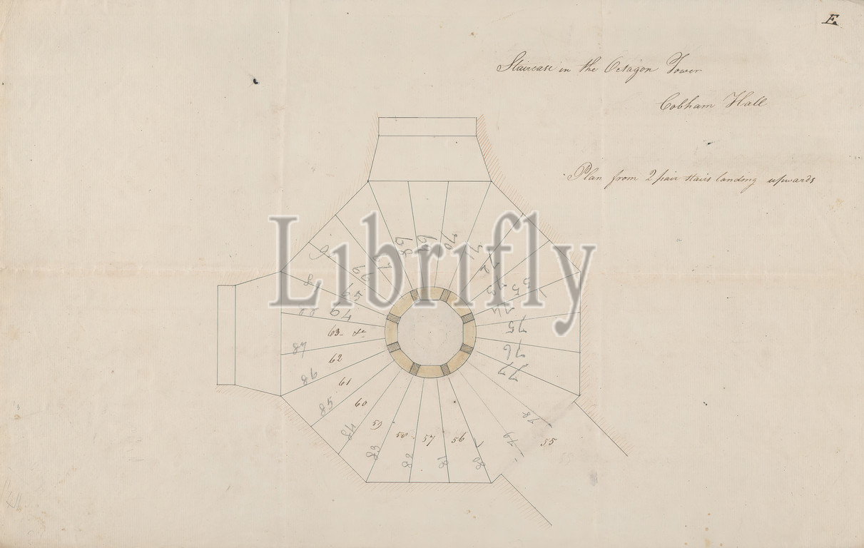 Cobham Hall, Kent, Plan, Tower Staircase, James Wyatt, 1746–1813, British, ca, 1790, Watercolor, brown, black ink, pen, graphite, moderately thick, moderately textured, cream laid paper, fold mark, Sheet, architectural subject, landings, stair components, octagons, plans, drawings, staircase, stairs, tower, building division, Cobham, Cobham Hall, England, Kent, United Kingdom