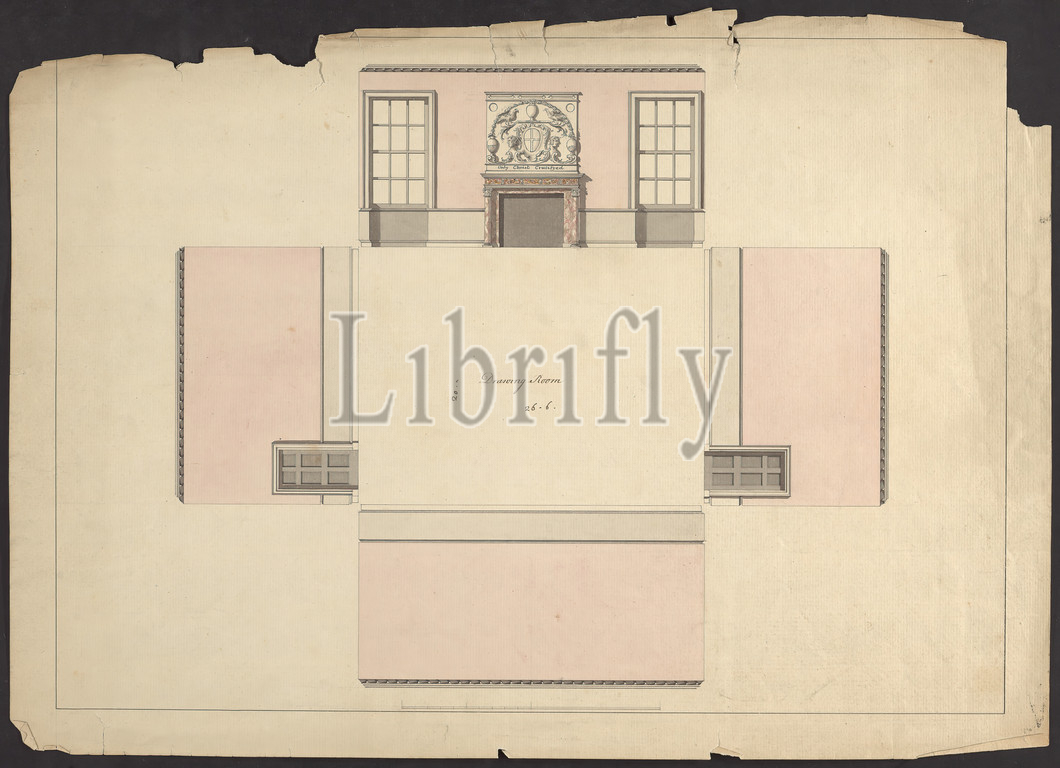 Cobham Hall, Kent, Section, drawing room, James Wyatt, 1746–1813, British, ca, 1790, Watercolor, pink, gray wash, pen, black ink, graphite, moderately thick, moderately textured, cream laid paper, Sheet, architectural subject, birds, crests, doors, drawing room, fireplace, mantels, marble, sections, urn, windows, Cobham, Cobham Hall, England, Kent, United Kingdom