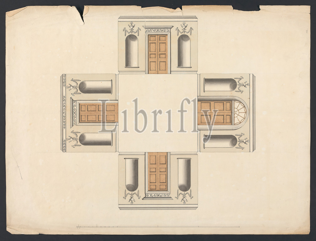 Cobham Hall, Kent, Section, Hallway, Four Doors, James Wyatt, 1746–1813, British, ca, 1790, Graphite, pen, black ink, gray wash, watercolor, moderately thick, moderately textured, cream laid paper, Sheet, architectural subject, doors, festoons, Neoclassical, sections, semicircular arches, urns, windows, Cobham, Cobham Hall, England, Kent, United Kingdom