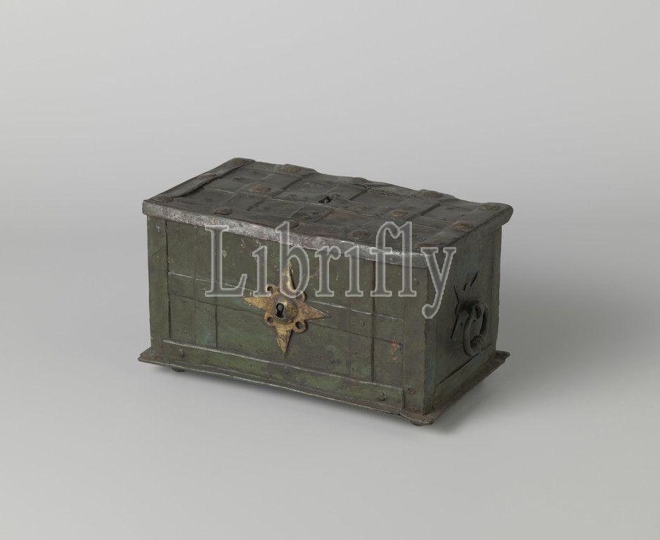 Coffin, A painted iron coffin with lock and two handles. The lock plate knocked out from inside and engraved., 1600 - 1699 and/or 1700 - 1800, iron (metal), engraving, h 13.5 cm × l 23.5 cm × d 13.0 cm