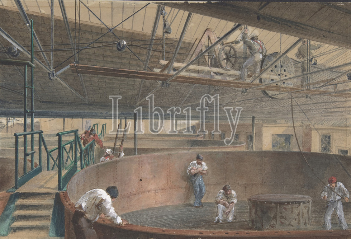 Coiling the Cable in the Large Tanks at the Works of the Telegraph Construction and Maintenance Company of Greenwich, 1865, 1865, Watercolor over graphite with touches of gouache, Sheet: 7 3/16 × 10 1/2 in. (18.2 × 26.6 cm), Drawings, Robert Charles Dudley (British, 1826–1909), One of the 19th century's great technological achievements was to lay a telegraphic cable beneath the Atlantic, allowing messages to speed back and forth between North America and Europe in minutes, rather than ten or twelve days by steamer