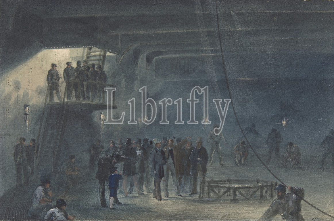 Coiling the Cable in the After-tank on Board the Great Eastern at Sheerness: Visit of H.R.H. the Prince of Wales on May 23rd, 1865, 1865–66, Watercolor over graphite with touches of gouache, Sheet: 6 11/16 in. × 10 in. (17 × 25.4 cm), Drawings, Robert Charles Dudley (British, 1826–1909), One of the 19th century's great technological achievements was to lay a telegraphic cable beneath the Atlantic, allowing messages to speed back and forth between North America and Europe in minutes, rather than ten or twelve days by steamer