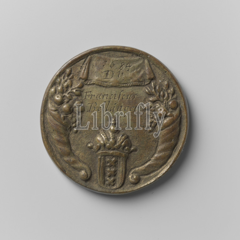 Collegium Medicum in Amsterdam, access token for the hortus medicus for Franciscus Bellanger, Brass token. Obverse: hand from clouds holds branch and ointment spatula, why snake wriggles itself in a wrap. Reverse: crowned coat of arms between two filled horns of abundance, in between: inscription under canvas with inscription, Amsterdam, Franciscus Bellinger, Collegium Medicum, Hortus Medicus, Aernout Naghtegael, 1684, brass (alloy), engraving, d 3.8 cm × w 27.40 gr