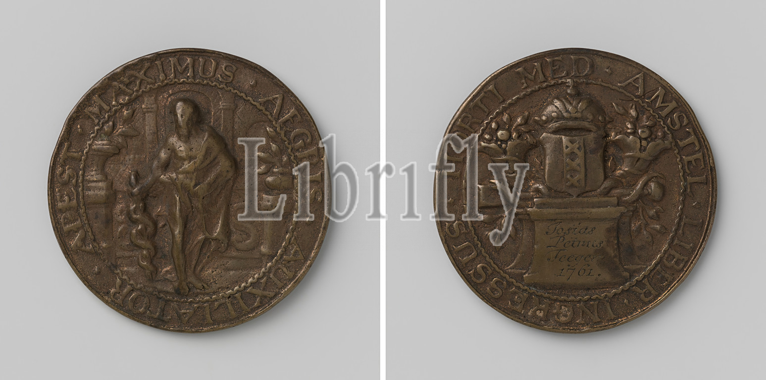 Collegium Medicum, Amsterdam, access token, Josias Petrus Teeger's hortus medicus, Copper Medal, Front, Aesculapius, right hand leaning, snake rod, left hand under, mantle, standing, two vases, plants, base, background wall, building within, inscription Reverse, crowned coat, arms, two filled horns, abundance, ointment spatula, why snake coils, lying, pedestal, inscription inside inscription, Hortus Medicus, Josias Petrus Teeger, Willem de Wijs, 1761, copper, metal, engraving
