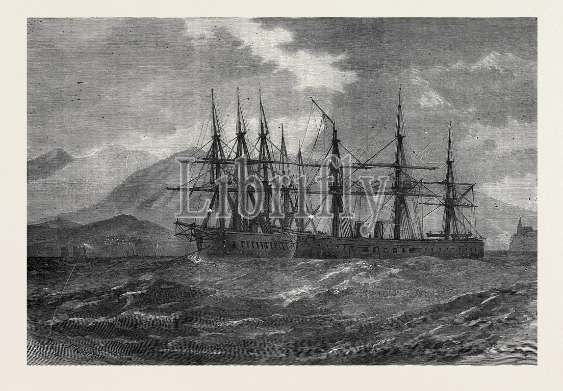collision, between, h.m.s., rthumberland, hercules, madeira, 1873, 1873 engraving, engraved image, history, illustrative technique, engravement, victorian, arts, culture, retro styled, vintage, retro, arkheia
