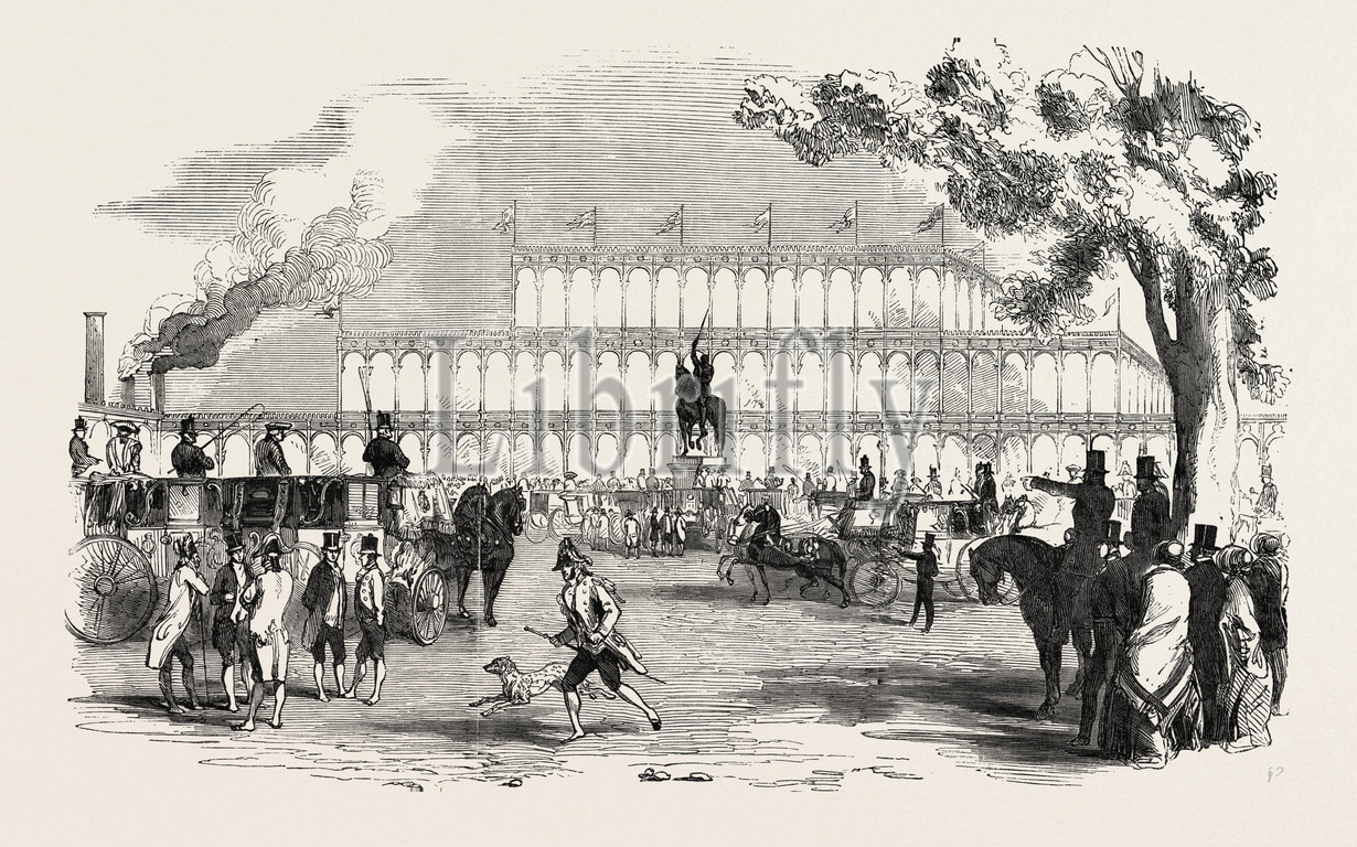 colossal, sculpture, monument, statue, richard, coeur, de, lion, western, end, great, display of works of art, exhibition, building, uk, 1851 engraving, engraved image, history, illustrative technique, engravement, engraving, victorian, arts, culture, 19th century style, retro styled, vintage, retro, arkheia, nineteenth century engraving, historic art