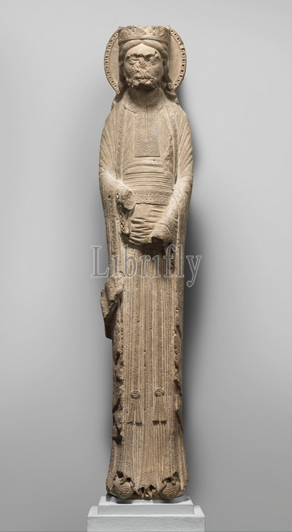 Column Statue of a King, ca. 1150–60, Made in Saint-Denis, French, Limestone, Overall: 45 1/2 x 9 x 9 1/2 in. (115.6 x 22.9 x 24.1 cm), Sculpture-Stone, The royal abbey at Saint-Denis housed the shrine of this national saint. It possessed many of the regalia of the kings of France, and the abbey served as their burial site. Under the energetic Abbot Suger (1122–51) the abbey was rebuilt in a new style that was hailed in the Middle Ages as “the French style” and subsequently called Gothic