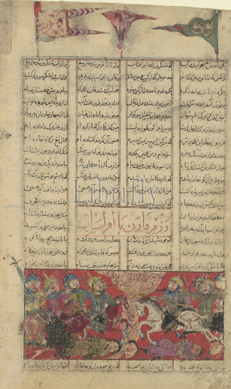 Combat, Qaran, Afrasiyab, Folio, Shahnama, Book, Kings, ca, 1330–40, Attributed, Iran, Isfahan, Ink, opaque watercolor, gold, silver, paper, Page, 8 x 5 1/8, 20.3 13 cm, Codices