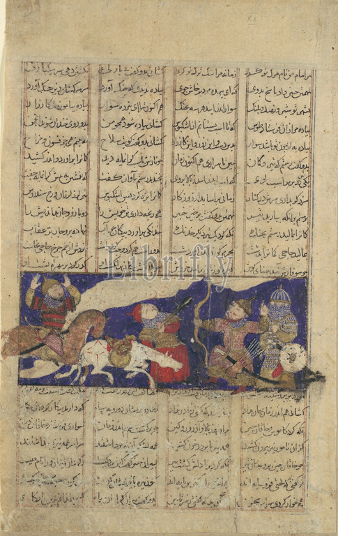 Combat, Rustam, Ashkabus, Folio, Shahnama, Book, Kings, ca, 1330–40, Attributed, Iran, Isfahan, Ink, opaque watercolor, gold, silver, paper, Page, 8 x 5 3/16, 20.3 13.2 cm, Codices, arrogant, enemy-hero, scorns, facing, foot, Rustam ensures, Ashkabus will, shooting, horse out, under, white cloud, dust, battle