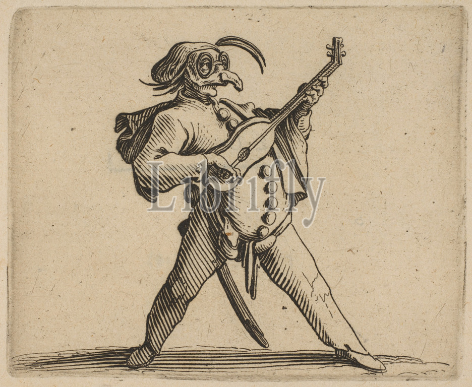 Le Comédien Masqué Jouant de la Guitare (The Masked Comedian Playing the Guitar), from Varie Figure Gobbi, suite appelée aussi Les Bossus, Les Pygmées, Les Nains Grotesques (Various Hunchbacked Figures, The Hunchbacks, The Pygmes, The Grotesque Dwarfs), 1616–22, Etching and engraving; first state of two (Lieure), Sheet: 7 5/16 x 10 3/8 in. (18.5 x 26.3 cm), Prints, Jacques Callot (French, Nancy 1592–1635 Nancy)