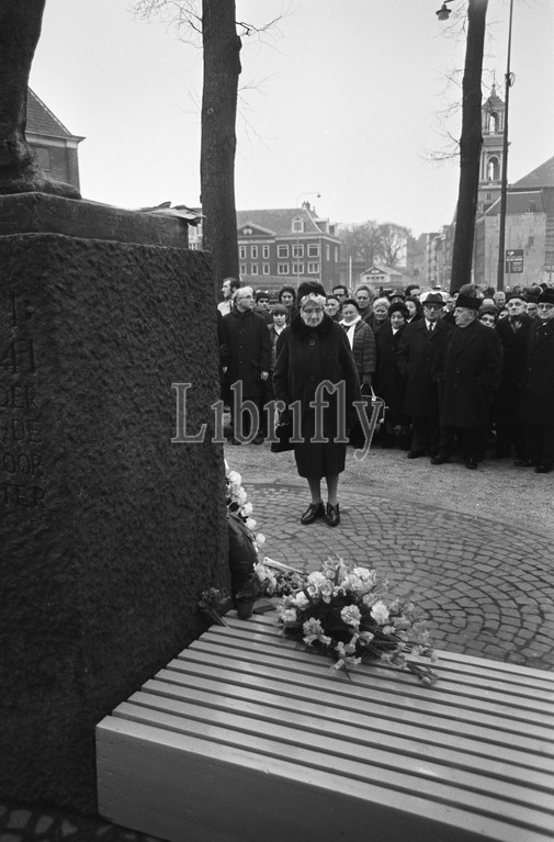 Commemoration, February Strike Docker J.D, Meijer Square Amsterdam, 3 Mayor Samkalden lay wreath, 4 statue Jutte places red flag, back, February 25, 1969, commemorations, Netherlands, 20th century, press agency photo, news to remember, documentary, historic photography, 1945-1990, visual stories, human history, Twentieth Century, moments in time