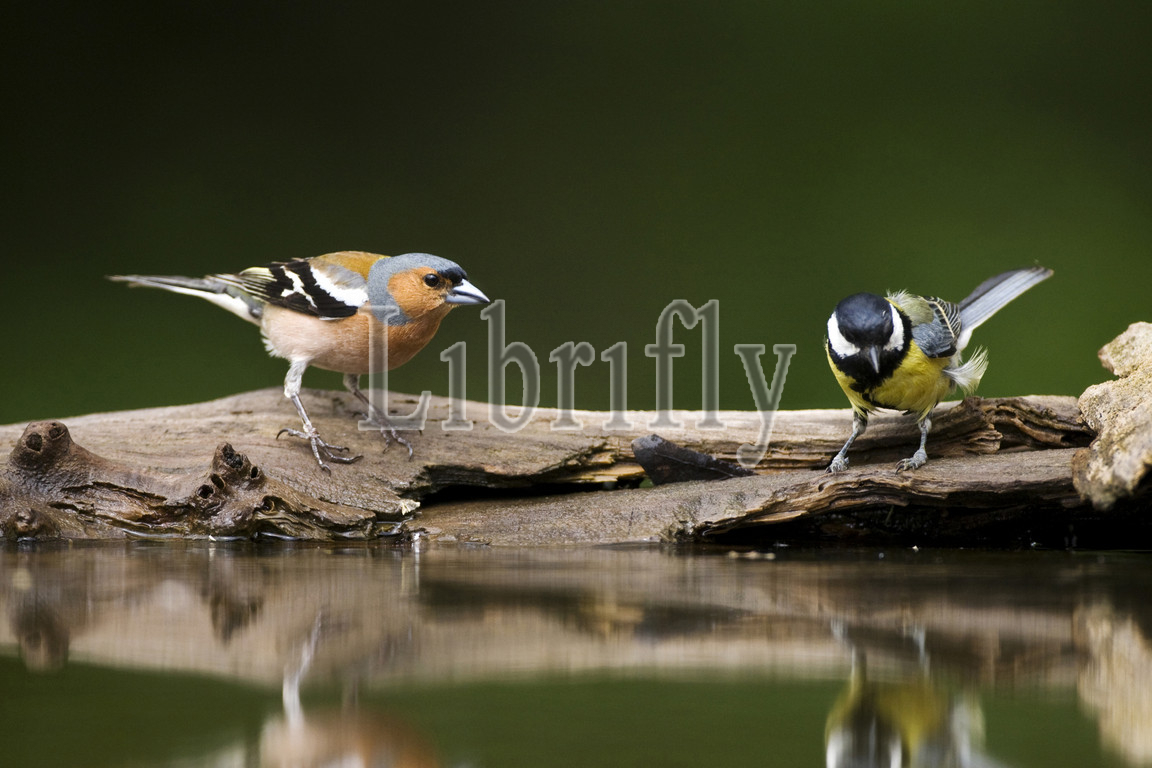 Common Chaffinch and Great Tit at forest drinking station, Parus major, Fringilla coelebs