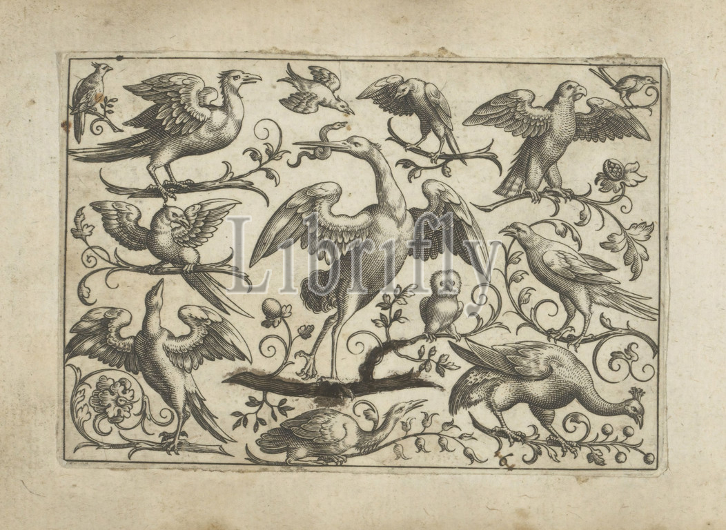 Common Crane, Twelve, Birds Birds, series title, common crane, spread wings, branch, surrounded, twelve, birds, owl, peacock, print, part, album, predatory birds, ornamental birds, owls, Paul Göttich, Augsburg, 1596, 1622, paper, engraving