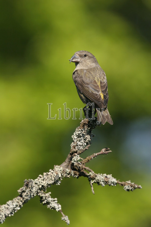 Common Crossbill female perched on branch Poland
