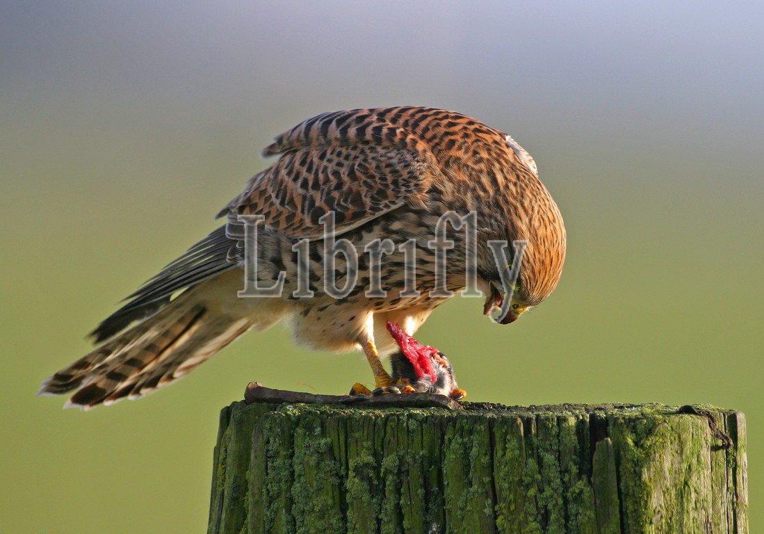 Common Kestrel with prey on pole, Falco tinnunculus, Netherlands