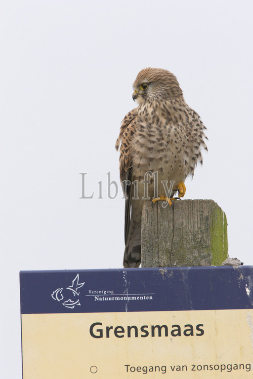 Common Kestrel, sitting, resting, pole, panel, nature reserve Elba Grensmaas alongside, Maas, Falco tinnunculus, Netherlands, nature, bird, animal, wildlife, wild, fauna, natural, feather, sky, beak, wing, outdoor, freedom, colourful, Liszt, Natural History, ornithology, vertebrate animals, photography, color image