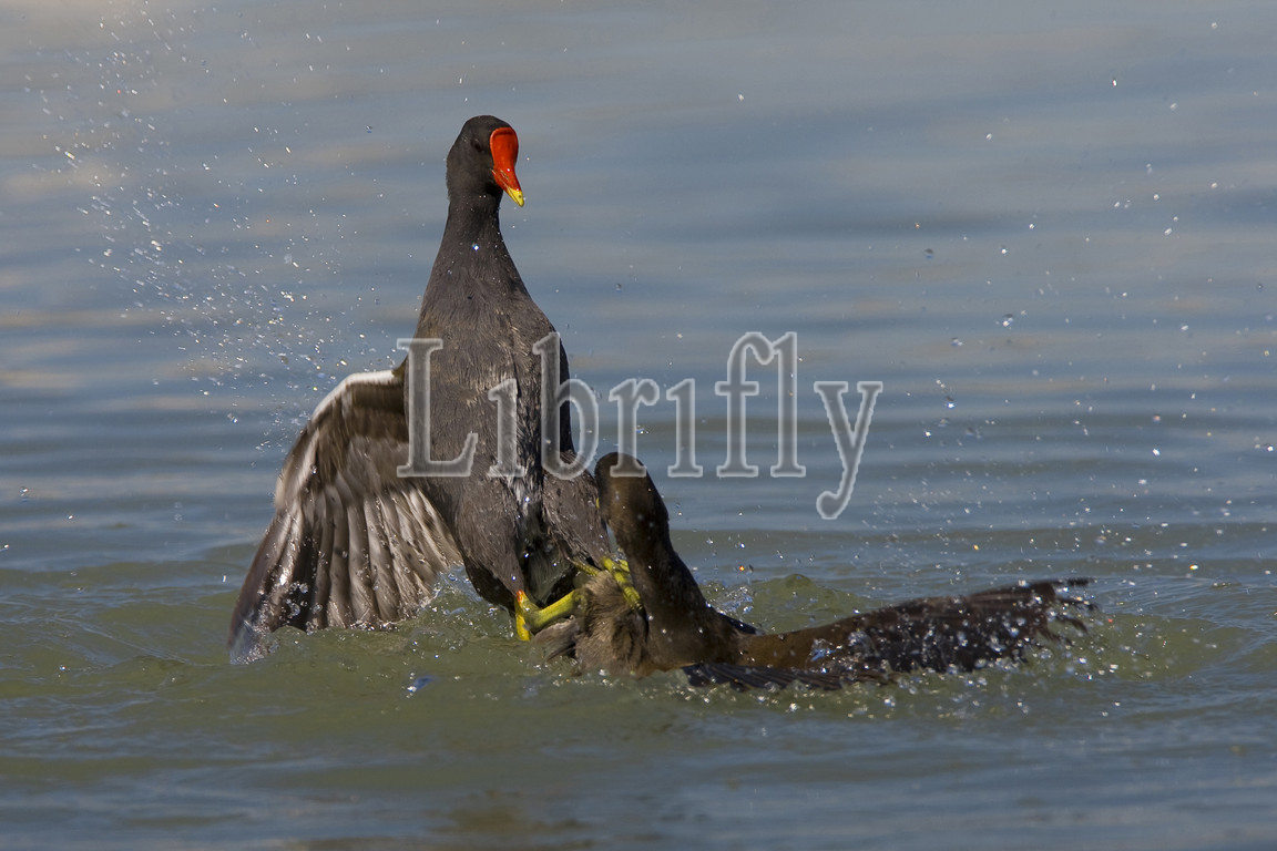 Common Moorhen, fighting, water, Gallinula chloropus, Italy, nature, bird, animal, wildlife, wild, fauna, natural, feather, sky, beak, wing, outdoor, freedom, colourful, Liszt, Natural History, ornithology, vertebrate animals, photography, color image