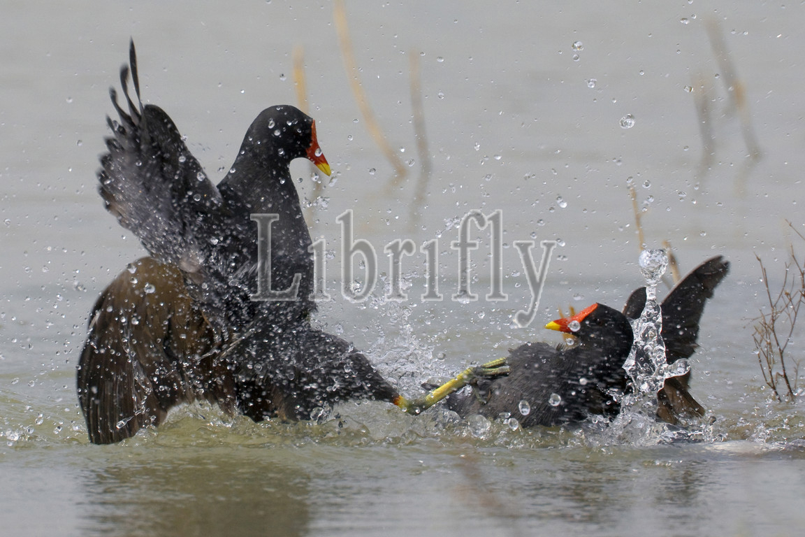 Common Moorhen fighting in water, Gallinula chloropus, Italy