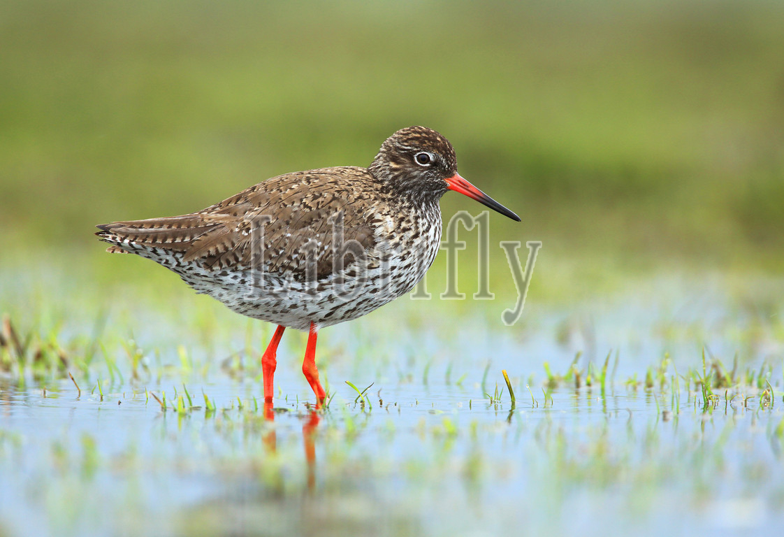 Common Redshank in a flooded meadow, Tringa totanus
