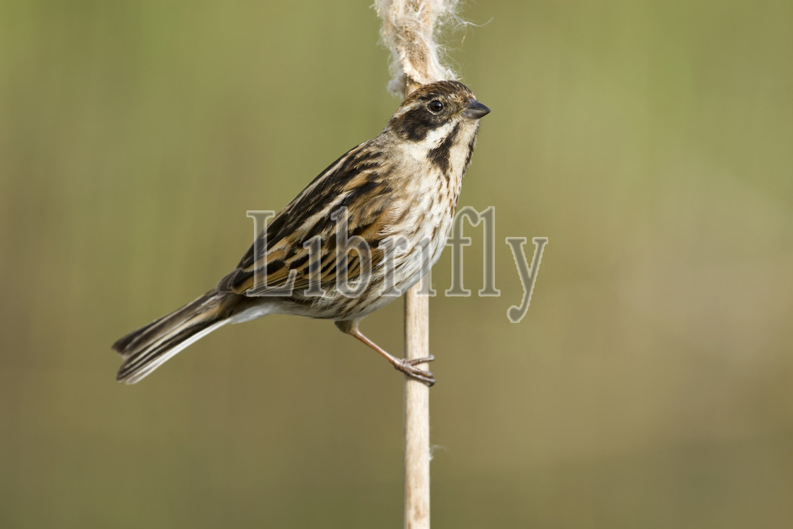 Common Reed Bunting on cattail stalk Netherlands, Emberiza schoeniclus, Netherlands
