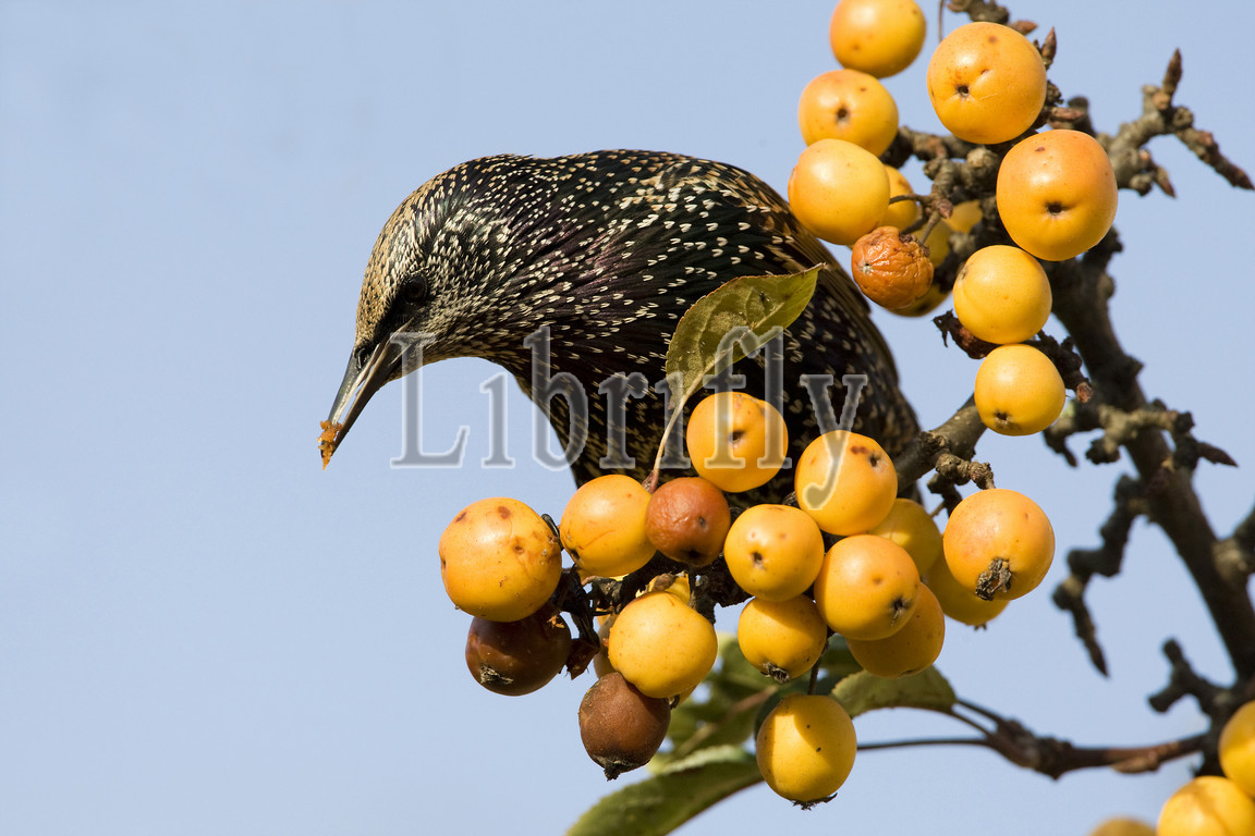 Common Starling, feeding, berries, Netherlands, Sturnus vulgaris, nature, bird, animal, wildlife, wild, fauna, natural, feather, sky, beak, wing, outdoor, freedom, colourful, Liszt, Natural History, ornithology, vertebrate animals, photography, color image
