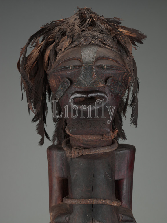 community power figure, Songye people, early 20th century, wood, cloth, feathers, fur, reptile skin, metals, pigment, H: 33 in., African Art