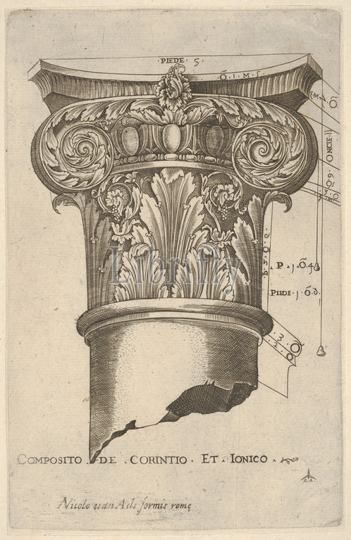 Composite capital with measurements, ca. 1537, Engraving, Sheet: 8 13/16 x 5 11/16 in. (22.4 x 14.5 cm), Master G.A. (Italian, active ca. 1535), Published as part of Antonio Lafreri's Speculum Romanae Magnificentiae (The Mirror of Roman Magnificence). This print comes from a scrapbook of 3 volumes with inlaid engraved and etched plates. It is likely that individuals who purchased the prints from Lafreri made their own selections and had them bound