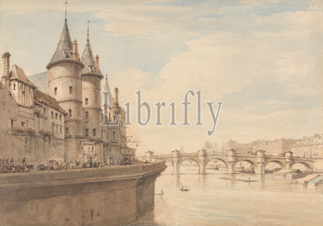 Conciergerie, Paris, Henry Edridge, 1769–1821, British, ca, 1818, Watercolor, pen, brown ink, graphite, moderately thick, moderately textured, beige, wove paper, architectural subject, Paris, Pont Neuf, Seine