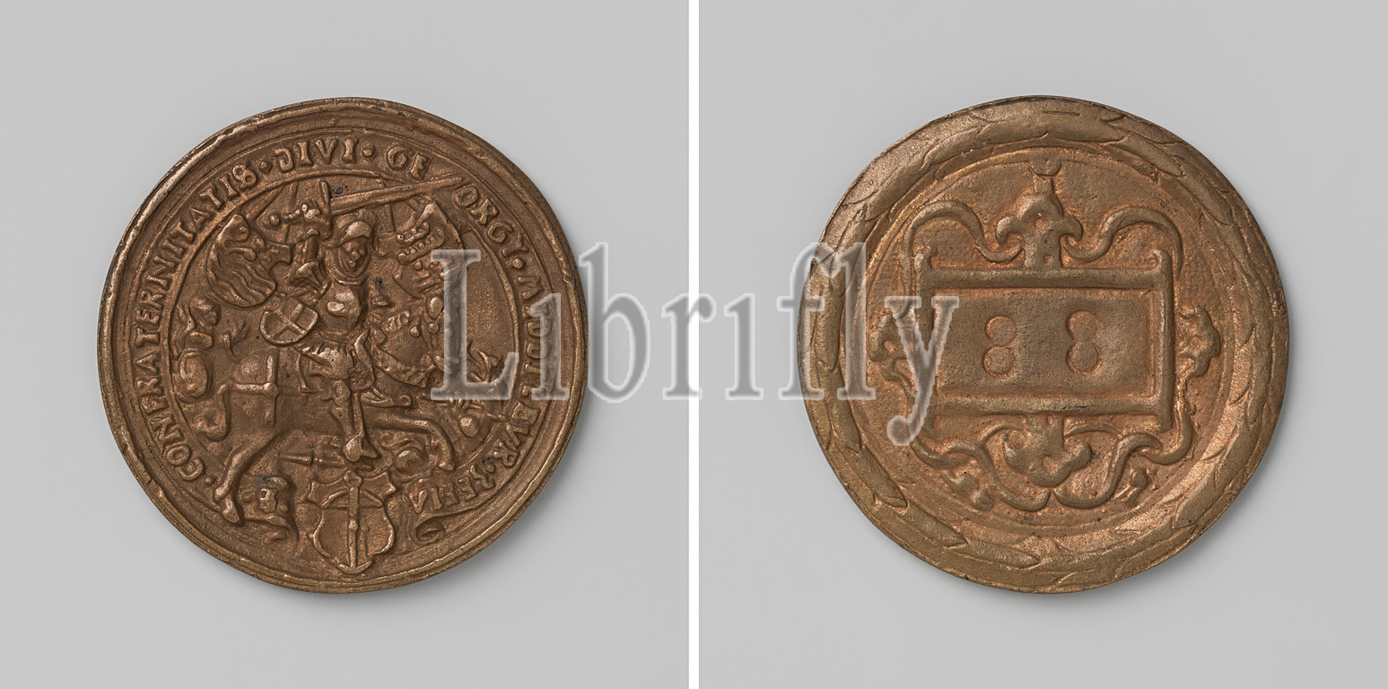 Confederacy of St. Joris in Middelburg, militia medal with no. 88, Brass medal. Obverse: armored St. George on horseback with sword in right hand raised above head fighting dragon lying on the ground, behind him: angel who protects him, on either side of his head: coat of arms within an inscription on pennant, interrupted by coat of arms. Reverse: figure 88 in decorated compartment inside wreath of olive leaves, Middelburg, anonymous, 1554, brass (alloy), engraving, d 4.4 cm × w 20.83 gr