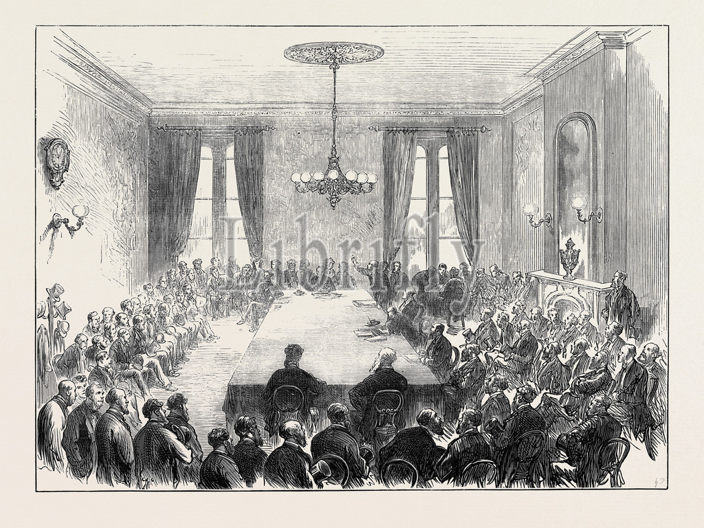conference, ironmasters, workmen's, delegates, cardiff, wales, 1873, uk, 1873 engraving, engraved image, history, illustrative technique, engravement, victorian, arts, culture, retro styled, vintage, retro, arkheia
