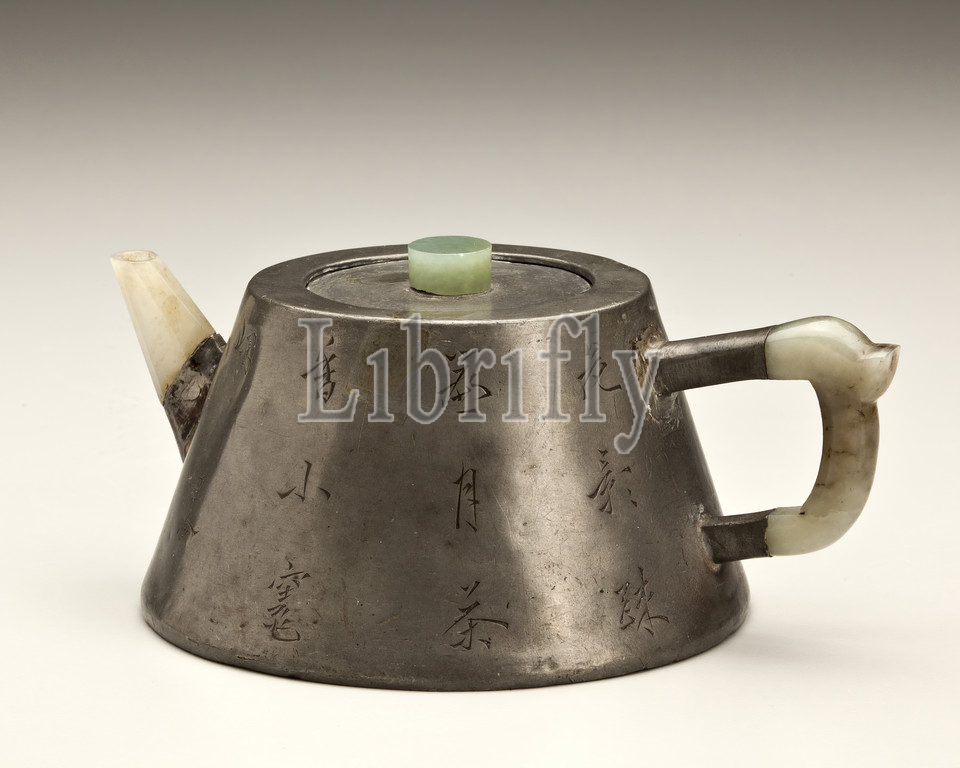 conical teapot with incised plum and poem, Chen Zhenyue (Chinese, 1736-1795), Qing dynasty, 18th century, Yixing Stoneware, pewter, jade, 3 x 4-1/2 x 6-1/4 in., Asian Art
