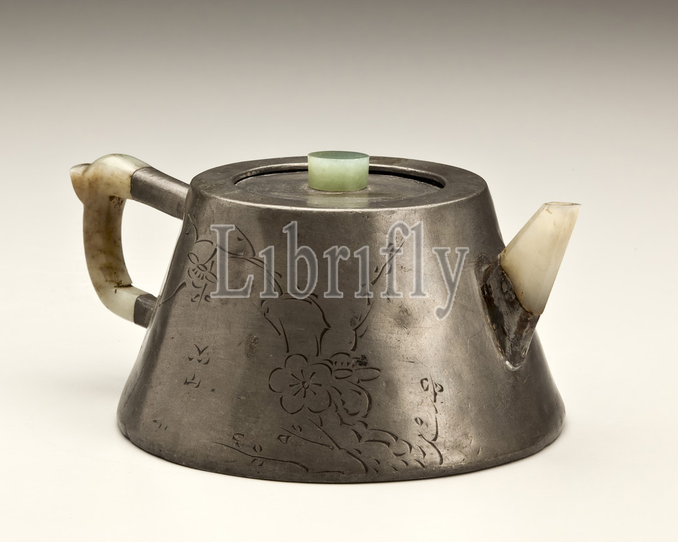 conical teapot with incised plum and poem, Chen Zhenyue (Chinese, 1736-1795), Qing dynasty, 18th century, Yixing Stoneware, pewter, jade, 3 x 4-1/2 x 6-1/4 in., Asian Art