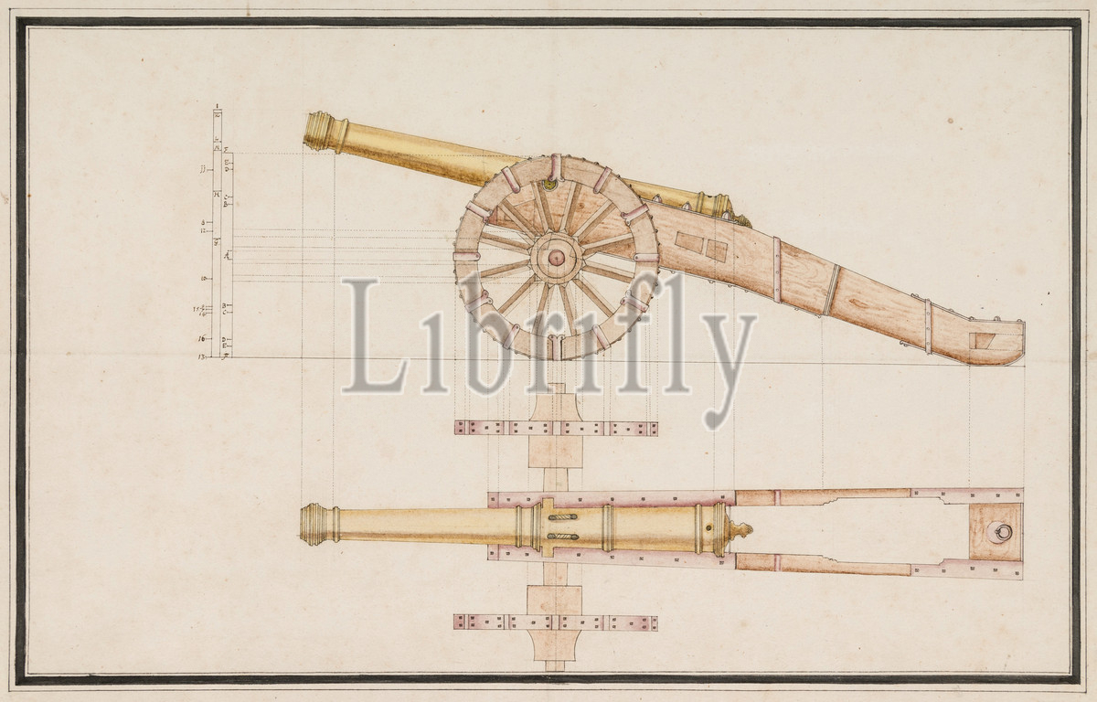 Construction Drawing, Cannon, 18th century, Western European, Pen, ink, wash, color, paper, 17 3/4 x 11 3/4, 45 29.8 cm, Works, Paper-Drawings