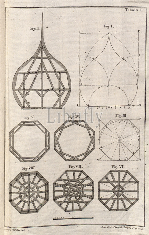 Construction drawing, roof truss 1, Illustrations, construction drawing, roof truss, 18th century, signed, Caspar Walter del, Ios., Ant. Sculpsite., Aug. Vind, Tabula I, p. 77, Walter, Caspar, del., Ant., sculp., 1769, Caspar Walter, Zimmerkunst oder Anweisung wie allerley Arten von deutschen, welschen Thurnhauben, auch Kugelhelme, nach der neuesten Manier, zu Bedeckung der Kirchenthürme nicht nur zu entwerfen, sondern auch mit Holz zu verbinden, Augsburg, verlegt von den Gebrüdern Veith, 1769